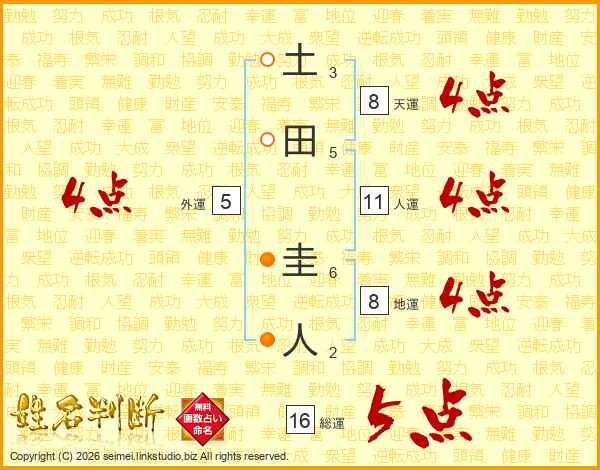 あなたの人生を表す1番重要な運勢です。生涯を通じて影響する総合運となり、主に50歳以降の晩年期に影響を及ぼします。苗字と名前の合計画数。