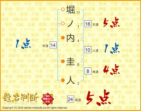 堀ノ内圭人さんの総運は24画の5点!