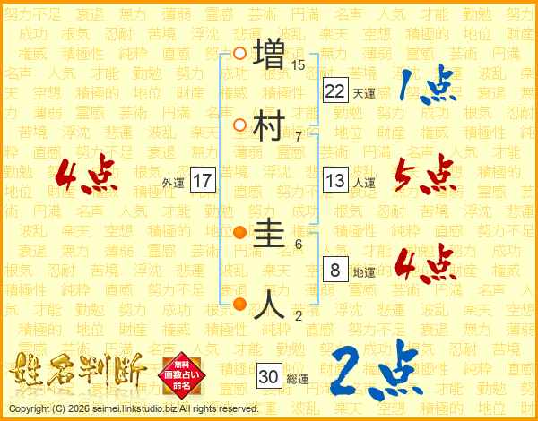 生活面を象徴する運勢です。外部から受ける影響力を表し、結婚運、家庭運や職場、環境への順応性を表します。総運から人運を引いた画数。姓や名が1文字の場合を除く。