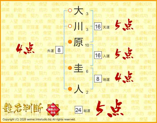 あなたの人生を表す1番重要な運勢です。生涯を通じて影響する総合運となり、主に50歳以降の晩年期に影響を及ぼします。苗字と名前の合計画数。