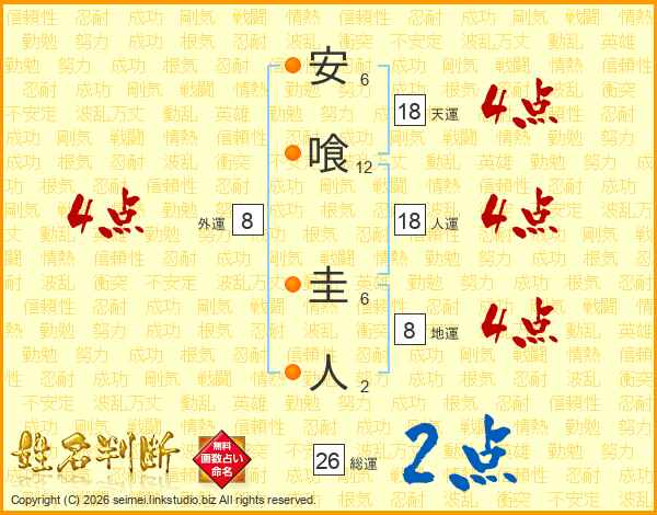生活面を象徴する運勢です。外部から受ける影響力を表し、結婚運、家庭運や職場、環境への順応性を表します。総運から人運を引いた画数。姓や名が1文字の場合を除く。