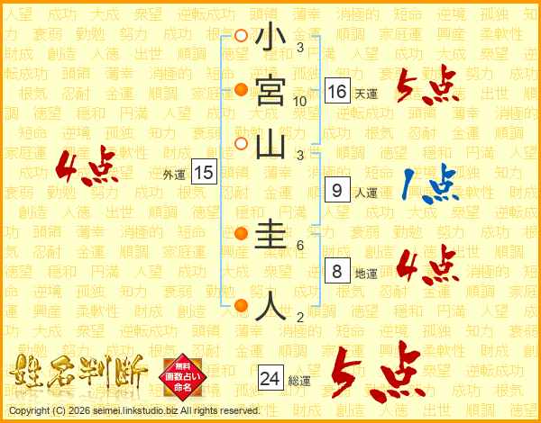 小(3画)宮(10画)山(3画) 圭(6画)人(2画)