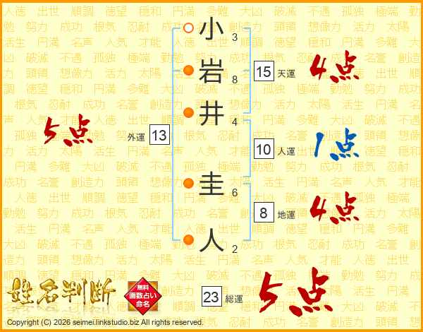 小岩井圭人さんの総運は23画の5点!