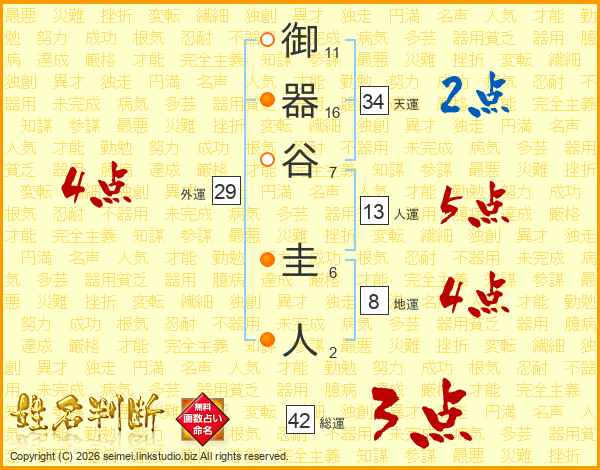 御(11画)器(16画)谷(7画) 圭(6画)人(2画)