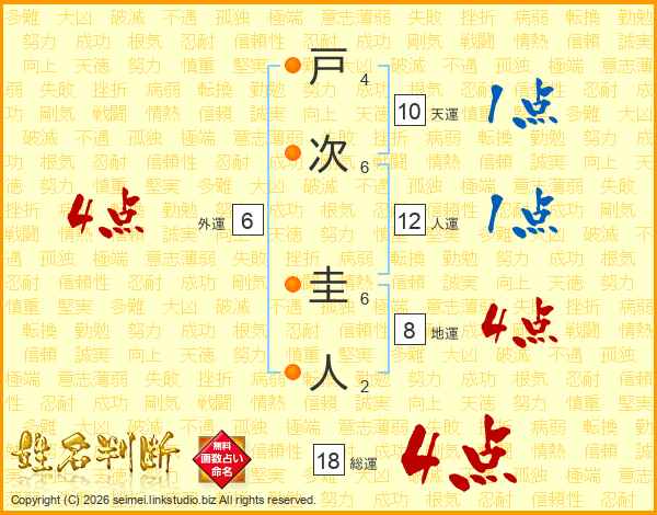 戸(4画)次(6画) 圭(6画)人(2画)