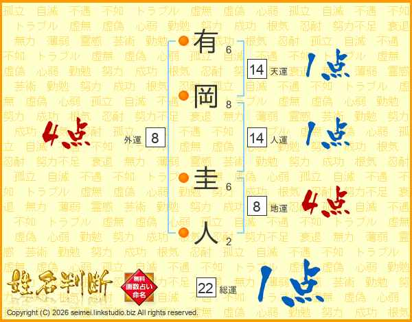 有岡圭人さんの人運は14画の1点!