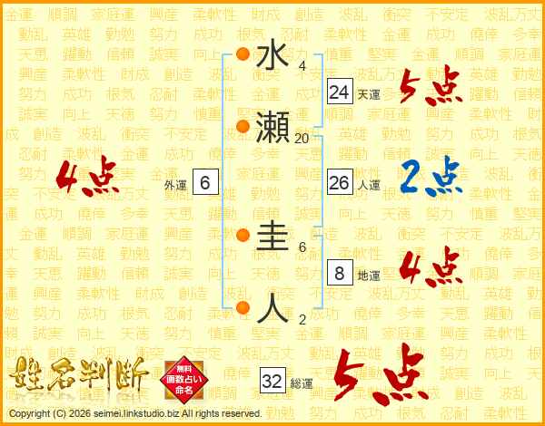 水(4画)瀬(20画) 圭(6画)人(2画)