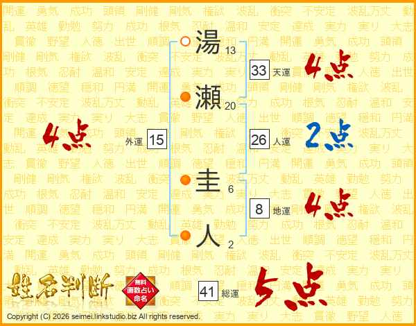 湯(13画)瀬(20画) 圭(6画)人(2画)