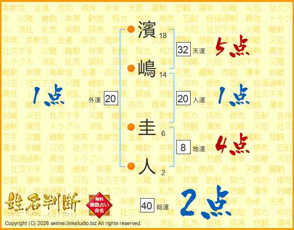 濱(18画)嶋(14画) 圭(6画)人(2画)