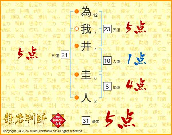 為(12画)我(7画)井(4画) 圭(6画)人(2画)