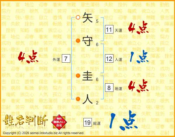 生活面を象徴する運勢です。外部から受ける影響力を表し、結婚運、家庭運や職場、環境への順応性を表します。総運から人運を引いた画数。姓や名が1文字の場合を除く。
