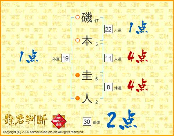 あなたの人生を表す1番重要な運勢です。生涯を通じて影響する総合運となり、主に50歳以降の晩年期に影響を及ぼします。苗字と名前の合計画数。