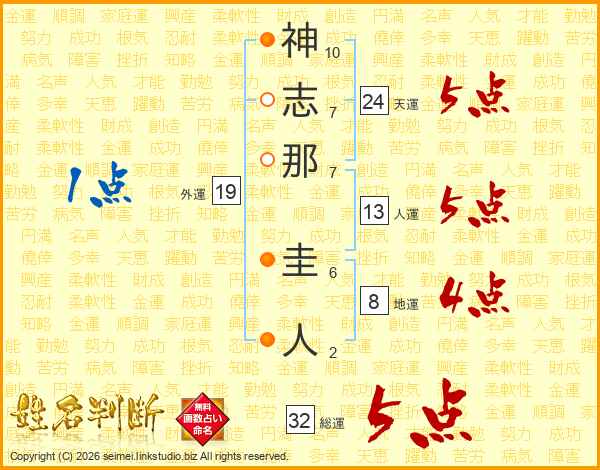 神志那圭人さんの総運は32画の5点!