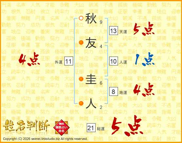 秋友圭人さんの総運は21画の5点!