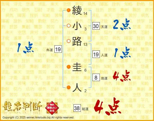 綾(14画)小(3画)路(13画) 圭(6画)人(2画)
