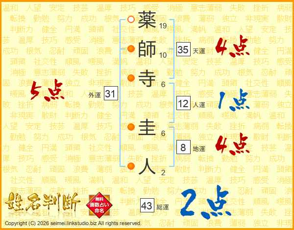 薬師寺圭人さんの総運は43画の2点!