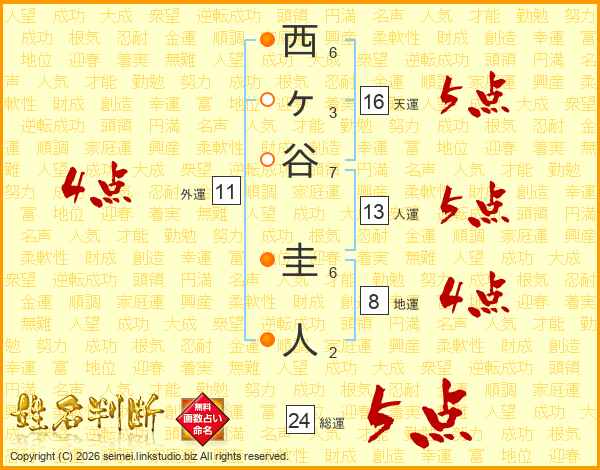 西ヶ谷圭人さんの総運は24画の5点!