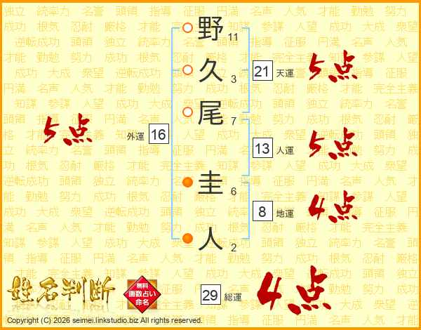 野(11画)久(3画)尾(7画) 圭(6画)人(2画)