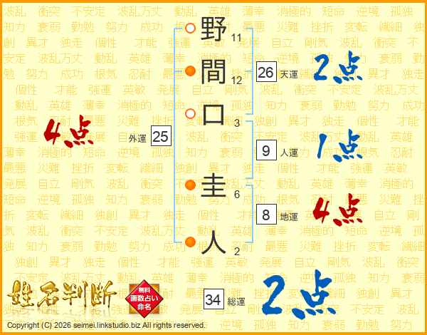 野(11画)間(12画)口(3画) 圭(6画)人(2画)