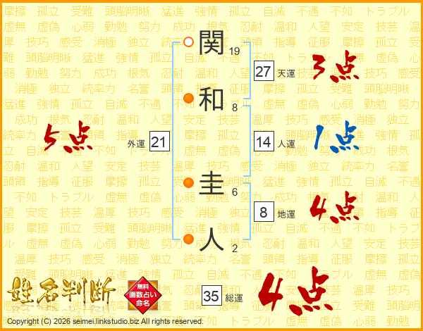 生活面を象徴する運勢です。外部から受ける影響力を表し、結婚運、家庭運や職場、環境への順応性を表します。総運から人運を引いた画数。姓や名が1文字の場合を除く。