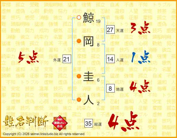 鯨(19画)岡(8画) 圭(6画)人(2画)