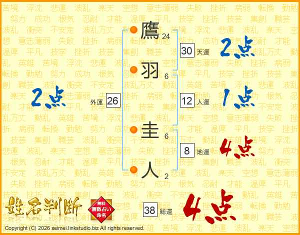 鷹羽圭人さんの総運は38画の4点!