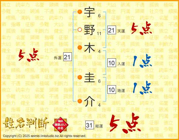 宇(6画)野(11画)木(4画) 圭(6画)介(4画)