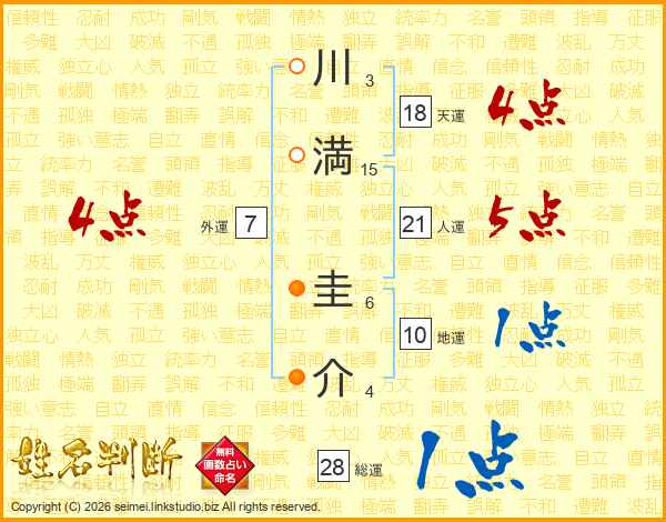 川(3画)満(15画) 圭(6画)介(4画)