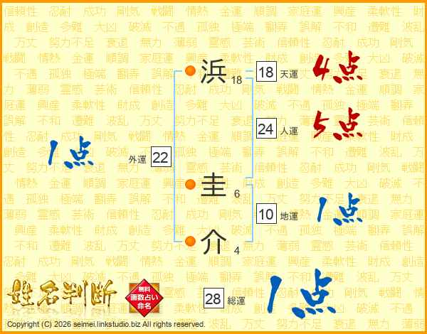 浜(18画) 圭(6画)介(4画)