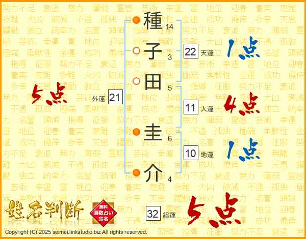 種(14画)子(3画)田(5画) 圭(6画)介(4画)