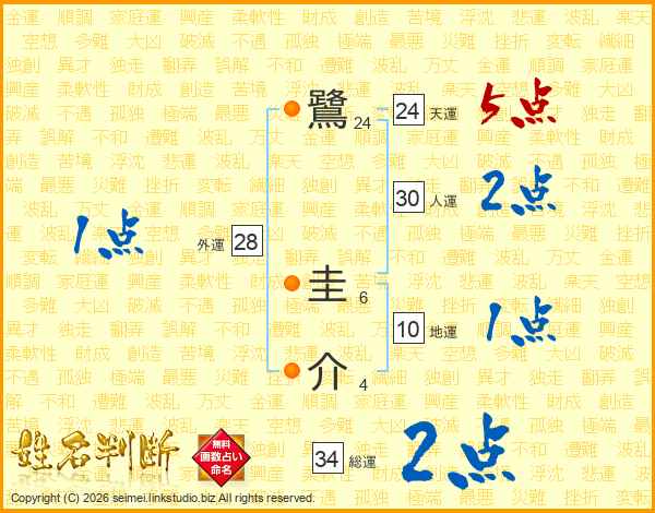 鷺圭介さんの総運は34画の2点!