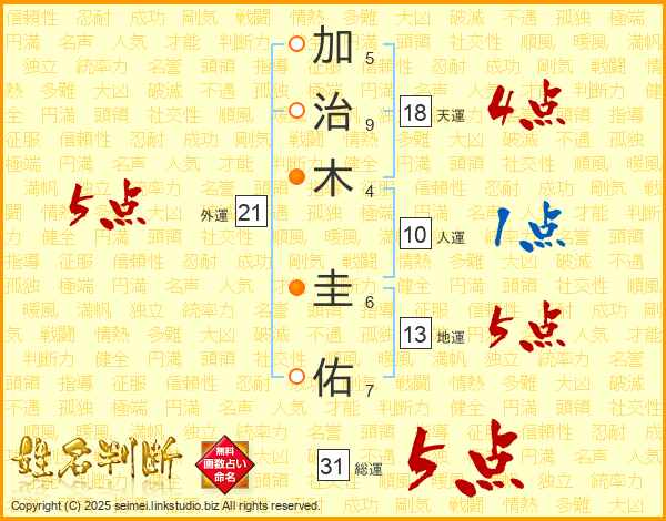 加(5画)治(9画)木(4画) 圭(6画)佑(7画)