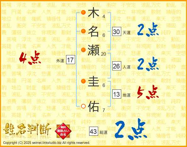 木(4画)名(6画)瀬(20画) 圭(6画)佑(7画)