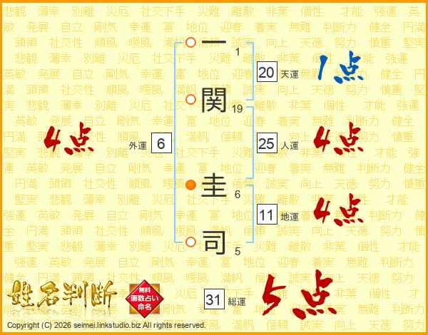 生活面を象徴する運勢です。外部から受ける影響力を表し、結婚運、家庭運や職場、環境への順応性を表します。総運から人運を引いた画数。姓や名が1文字の場合を除く。