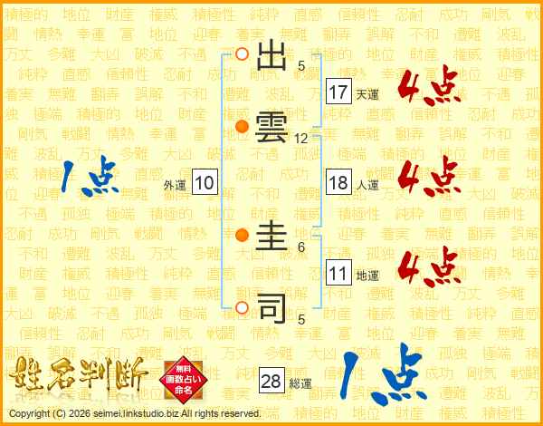 生活面を象徴する運勢です。外部から受ける影響力を表し、結婚運、家庭運や職場、環境への順応性を表します。総運から人運を引いた画数。姓や名が1文字の場合を除く。