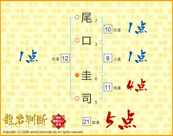 生活面を象徴する運勢です。外部から受ける影響力を表し、結婚運、家庭運や職場、環境への順応性を表します。総運から人運を引いた画数。姓や名が1文字の場合を除く。