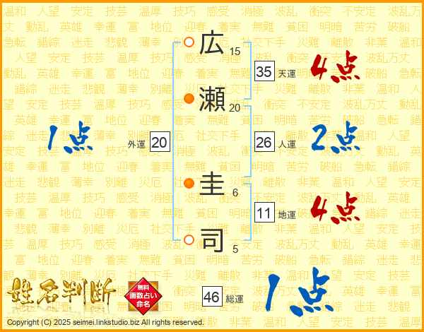 広(15画)瀬(20画) 圭(6画)司(5画)