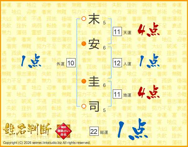 生活面を象徴する運勢です。外部から受ける影響力を表し、結婚運、家庭運や職場、環境への順応性を表します。総運から人運を引いた画数。姓や名が1文字の場合を除く。