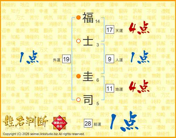 生活面を象徴する運勢です。外部から受ける影響力を表し、結婚運、家庭運や職場、環境への順応性を表します。総運から人運を引いた画数。姓や名が1文字の場合を除く。