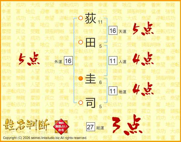 荻(11画)田(5画) 圭(6画)司(5画)