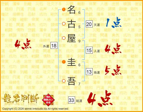 名(6画)古(5画)屋(9画) 圭(6画)吾(7画)