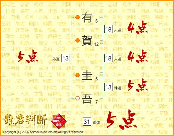 有(6画)賀(12画) 圭(6画)吾(7画)