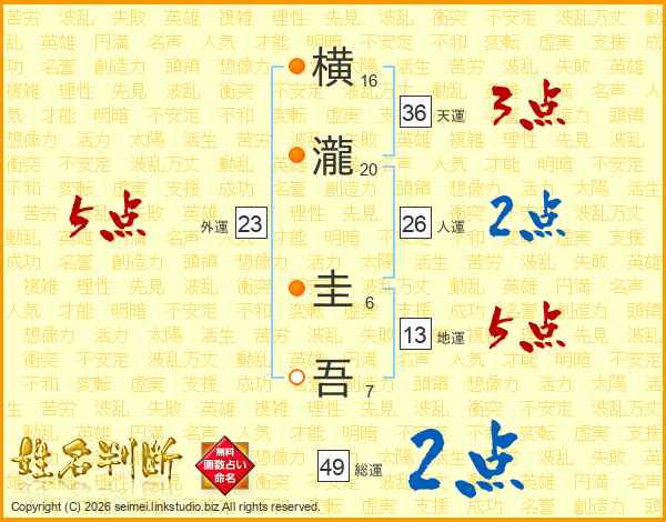横(16画)瀧(20画) 圭(6画)吾(7画)