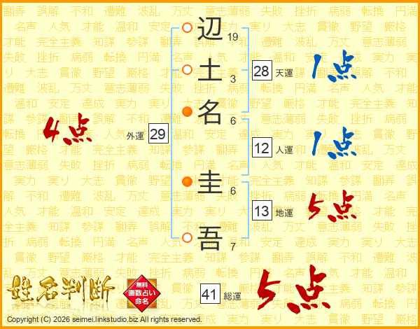 辺(19画)土(3画)名(6画) 圭(6画)吾(7画)