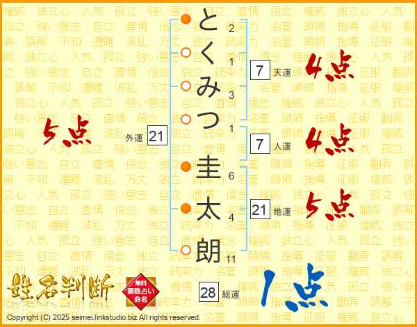 と(2画)く(1画)み(3画)つ(1画) 圭(6画)太(4画)朗(11画)