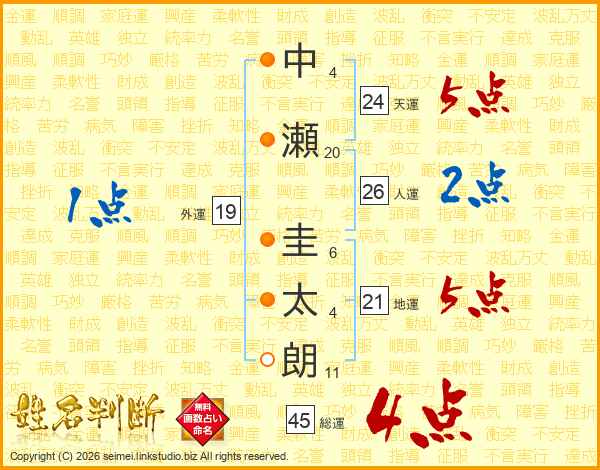 中瀬圭太朗さんの総運は45画の4点!
