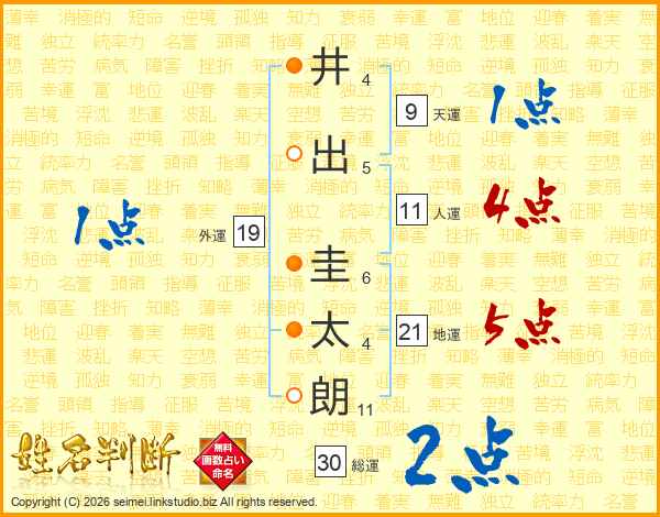 井(4画)出(5画) 圭(6画)太(4画)朗(11画)