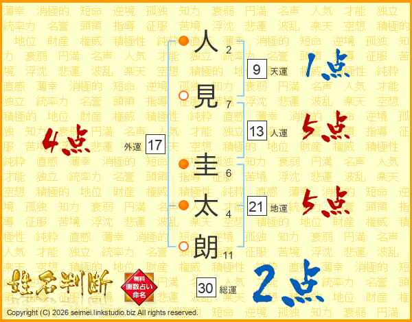 人(2画)見(7画) 圭(6画)太(4画)朗(11画)