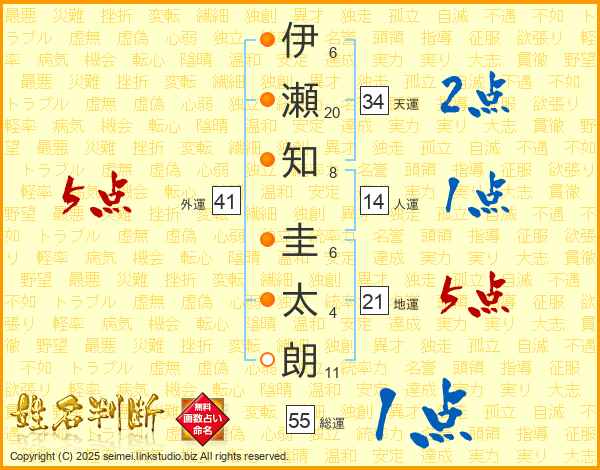 伊(6画)瀬(20画)知(8画) 圭(6画)太(4画)朗(11画)