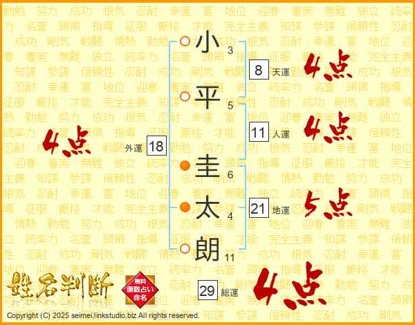 小(3画)平(5画) 圭(6画)太(4画)朗(11画)